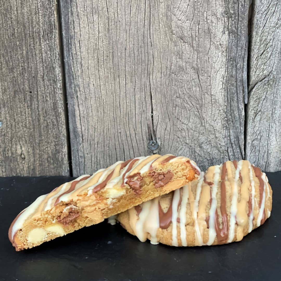 Our signature vanilla dough is packed with creamy white chocolate and milk chocolate chips, delivering the perfect balance of sweetness and richness in every bite. But the real magic is on top - each cookie is finished with a generous drizzle of white chocolate, milk chocolate, and Caramilk chocolate, making this a triple chocolate sensation you won’t want to miss.